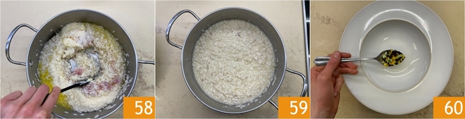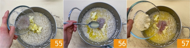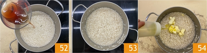 Continue cooking by adding the infusion little by little for the remaining 5-6 minutes 52; cooking times depend on the quality of the rice. Once the rice is cooked 53, finish with cold butter and oil 54.