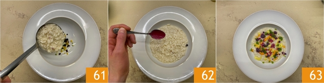 Cover with the risotto 61 and distribute the sauces with a teaspoon (or you can use small squeeze bottles) letting them fall like rain 62. The creamy risotto with Sicilian caponata is ready to be enjoyed 63!