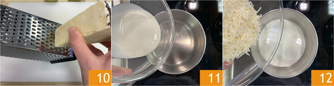 Meanwhile, prepare the fondue. First, grate the pecorino 10. In a small saucepan pour the heavy cream 10 and add the grated pecorino 12.