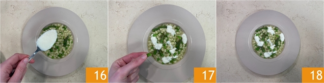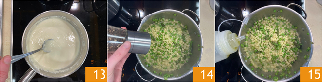 Let it melt over very low heat 13, stirring occasionally, until you obtain a smooth, homogeneous cream. When the tubetti are cooked and creamy, turn off the heat. Add a grind of black pepper 14 and finish by tossing them with a drizzle of extra virgin olive oil 15.
