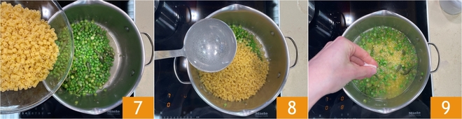 At this point add the tubetti directly into the saucepan 7 and immediately add a ladleful of hot water 8. Continue cooking as if making a risotto: stir frequently and add more hot water little by little as it is absorbed, until the pasta is al dente. Season with salt during cooking 9.