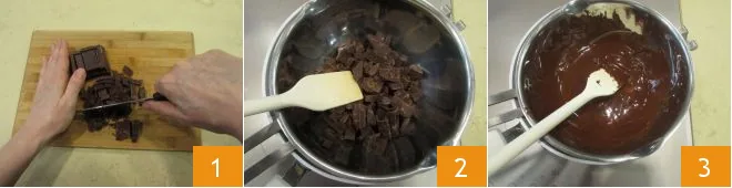 To prepare the chocolate buttercream, start by chopping the dark chocolate 1, then transfer it to a bowl 2 and melt it in a double boiler, stirring often 3.