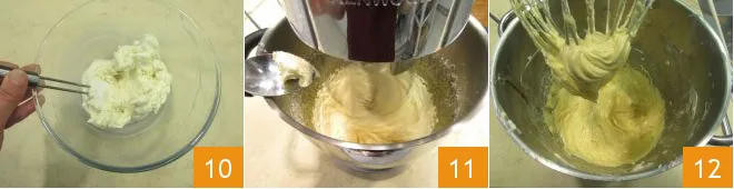 with the help of a spatula, start working it into a cream until you obtain a soft and homogeneous mixture 10. Then, gradually add the butter into the running mixer 11, until it's all incorporated; you should obtain a creamy mixture 12.