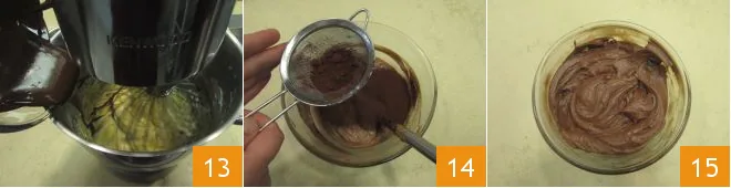 With the whisk still running, slowly incorporate the now cooled melted chocolate into the mixer 13, then transfer the cream into a bowl and also add the sifted cocoa powder 14. Mix with a spatula until everything is combined and your chocolate buttercream will be ready 15.