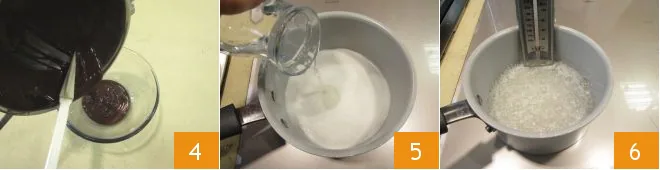 When it is completely melted 4, pour it into a bowl and let it cool, stirring occasionally. Meanwhile, prepare the syrup that will pasteurize the egg yolks and give your cream a firmer structure: pour the sugar into a saucepan, add the water 5, and let it simmer until it reaches a temperature of 250°F 6; you can use a kitchen thermometer for this operation.