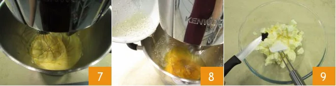 When the syrup in the saucepan reaches 239°F, pour the egg yolks into the bowl of a stand mixer and start whipping them 7. As soon as the syrup reaches the indicated temperature, pour it slowly into the mixer while it is still running 8 and continue to work until it cools completely. Meanwhile, transfer the softened butter, cut into cubes, into a bowl, add the seeds of half a vanilla bean 9;