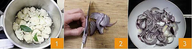 To prepare the cauliflower cream with torcello, first wash and clean the cauliflower, cut the florets and cook them in salted boiling water for 10 minutes (5 if using a pressure cooker) along with two bay leaves 1. Once cooked, drain and let them cool. Meanwhile, thinly slice the onion 2, heat a non-stick pan with butter, and then add the sliced onion 3.