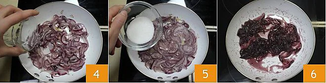 When the onion starts to sizzle, add the water 4, let it absorb a bit, and then add the sugar 5. Let all the water absorb and slightly caramelize the sugar 6, this will take about ten minutes, then remove from heat and set the onions aside.