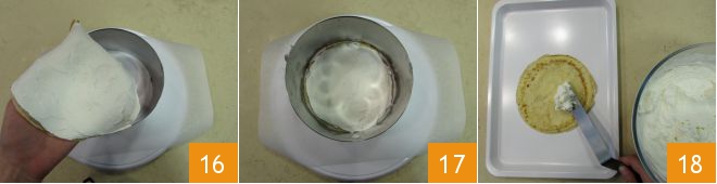 Then place it inside the ring, making sure that the cream faces you (16-17). Take the second crepe, cover it with cream 18.