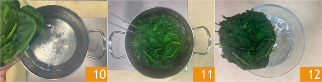 Meanwhile, blanch the spinach in salted boiling water 10, blanch just for 2-3 minutes and drain them using a slotted spoon 11, then transfer them to a bowl with ice water 12; this way, you will stop the cooking and preserve the color of the spinach.