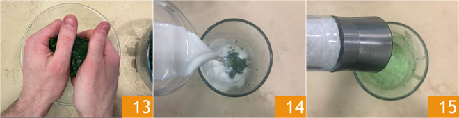 Squeeze the spinach well 13 and transfer them to a blender; pour in the milk 14, adjust the salt 15, and blend until you get a smooth and homogeneous sauce.