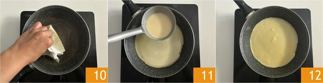 Remove any excess oil with a kitchen paper 10. Pour a ladle of batter 11 to cover the bottom 12.