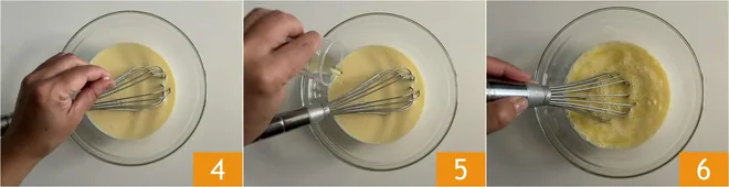 Add a pinch of salt 4 and the extra virgin olive oil 5, continuing to mix with the whisk 6.