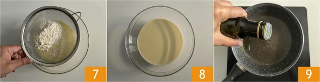 Now incorporate the sifted flour through a sieve, a little at a time 7, always mixing with the whisk to avoid lumps and obtain a smooth and homogeneous batter 8. Pour a little oil into a pan with a diameter of approximately 7 inches 9.