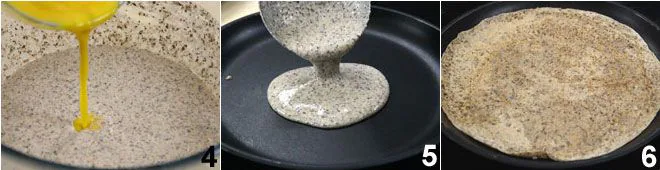 To prepare the basic batter for buckwheat crepes, start by placing the buckwheat flour in a bowl, then add the sifted all-purpose flour and half a teaspoon of salt. Stir with a wooden spoon and then incorporate the milk 1 and water gradually 2. Mix the ingredients well, making sure not to form lumps, and finally add the oil 3