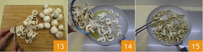 Transfer the béchamel to a bowl, cover with plastic wrap, and take care of the champignon mushrooms. Clean them with a damp cloth, scraping off excess soil with a small knife, then cut off the ends of the stems and slice your champignons 13. Pour the oil into a pan, add the garlic, and let it brown over low heat; add the mushrooms 14 and let them cook for about 5-10 minutes until wilted, then remove the garlic 15.
