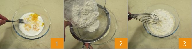To prepare the crepes with mushroom cream, start by making the Sweet and savory crepes (Basic recipe) batter. First, melt the butter and let it cool slightly. Meanwhile, beat the eggs in a bowl, add the milk, a pinch of salt, and mix the ingredients with a fork 1. Sift the flour directly into the mixture 2 and quickly stir with a whisk 3 to avoid lumps.