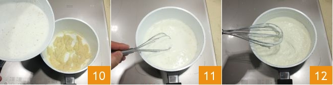 Put the saucepan back on the heat and let your roux turn golden, stirring quickly, then slowly pour in the now-warm milk 10 and continue mixing with the whisk to incorporate it well 11. Finish cooking your béchamel for 5-6 minutes, stirring often, until it has thickened and begins to boil 12.