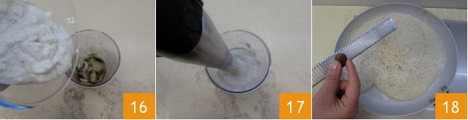 Transfer about half of the mushrooms (the remaining portion will be used later) to the glass of an immersion blender along with the béchamel 16 and blend everything for a few seconds until smooth 17. Pour it into a pan, add a grating of nutmeg, season with salt and pepper, and set aside 18.