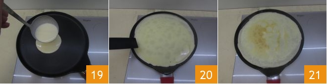 After the necessary time, butter the special crepe pan (we used an 11-inch one) and heat it over the stove. Take the batter from the refrigerator and pour a ladleful onto the hot pan 19. To spread it evenly over the entire surface, you can use a crepe spreader or tilt and rotate the pan to distribute the batter across the pan; be sure to be very quick in this step, as the batter tends to cook quickly. Wait about 1 minute 20 and flip it to cook the other side until it is slightly golden 21.