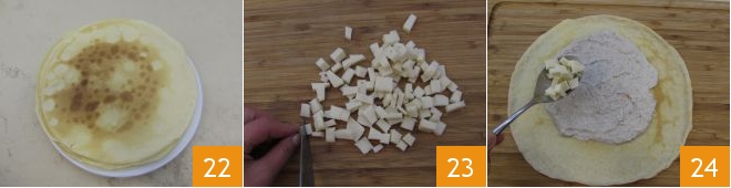 Continue this way until all the batter is used up. As your crepes are ready, you can stack them on a plate 22. At this point, cut the fontina into cubes 23. Slightly warm the mushroom béchamel, pour a couple of tablespoons on each crepe, spread it in the center of the disk, and add the fontina cubes 34.