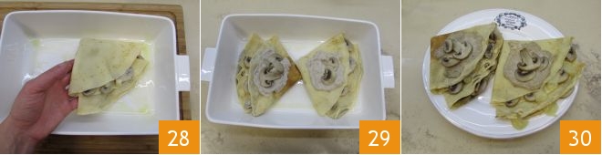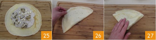 Also place a few mushrooms set aside previously 25 and fold your crepe first in half 26 and then again in half to form a triangle 27.