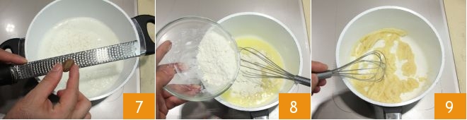 While the batter rests, prepare the filling by making the Béchamel sauce. Pour the milk into a saucepan and bring it to a simmer over very low heat. Then flavor it with nutmeg 7 and add a pinch of salt. In the meantime, prepare the roux: pour the butter into another saucepan and let it melt gently, then, away from the heat, add the sifted flour, sprinkling it in 8 and mix quickly with a whisk 9.
