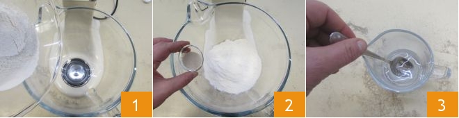 To prepare the fritters, start by sifting the flour into a bowl using a very fine mesh sieve 1. Then pour the flour into a mixer and add the yeast 2. In the meantime, take the sugar. Pour it into a glass container and dissolve it in lukewarm water to allow the sugar to melt 3.