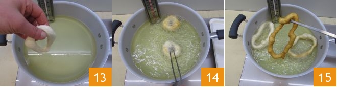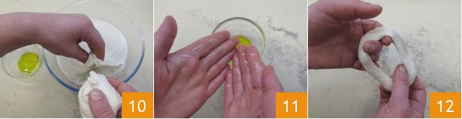After the necessary time for rising, take the dough and cut it into small pieces weighing about 0.88-1.06 oz each 10. Oil your hands with 2 tsp of oil 11 so you can shape the dough as desired 12. We recommend a ring shape, taking each piece of dough and piercing the center with your fingers, then expanding it.