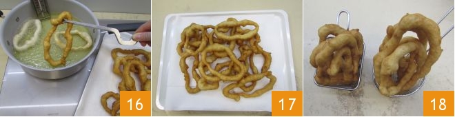 Once fried, use kitchen tongs to place them on absorbent paper to release excess oil 16. Repeat the operation for all the rings you've prepared 17. Once they've released excess oil, salt your fritters to taste and serve immediately 18.
