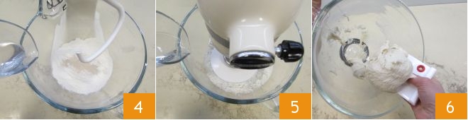 At this point, pour the dissolved sugar into the bowl with flour and yeast 4 and the water, and using a stand mixer with a dough hook, begin to mix all the ingredients, continuing to add water gradually 5 until you achieve a homogeneous mixture where the liquids are absorbed 6.