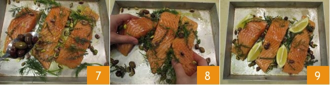 and the olives 7. Massage and mix the ingredients so they season evenly 8. Now add the lemon you grated, cut into wedges 9. Bake the salmon in a preheated static oven at 392°F for 20 minutes.