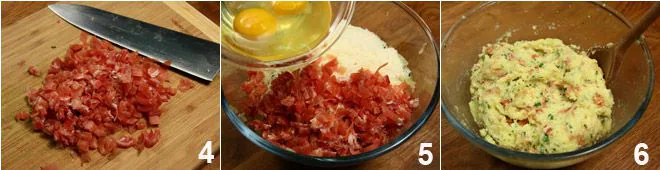 Next, chop the speck and add it to the mixture 4, then add the eggs and grated Grana Padano cheese 5. Mix all the ingredients well 6