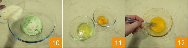 Transfer the cream into a bowl and add the grated Grana Padano DOP 10. Meanwhile, break the eggs and separate the yolks from the whites into two different bowls (the whites will be used for the breading) 11. Beat the yolks with a fork 12,