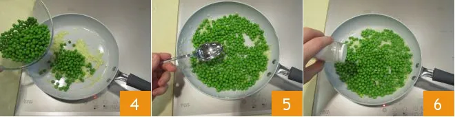 Then pour in the shelled peas 4, add some water 5 and a pinch of salt 6; let them cook for about ten more minutes, until the water has completely evaporated.