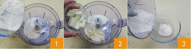 To prepare the tart with mixed pesto and bacon, start with the preparation of Easy Shortcrust Pastry. Combine in a mixer the flour 1, cold butter from the fridge cut into pieces 2, a pinch of salt, and blend everything until you get a sandy and floury mixture 3.