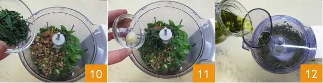 Then add the pistachios, chives 10, and garlic clove 11, then pulse the mixer several times, rather than continuously, pouring the oil in a thin stream 12.