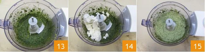Once you have obtained a homogeneous pesto 13, add the ricotta 14 and turn the mixer on for a few moments more to blend everything 15.