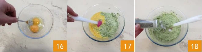 In a separate small bowl, beat the eggs 16 and pour them into the freshly prepared pesto 17, add salt and pepper, then mix again with a spatula 18.