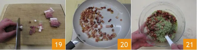 At this point, cut the bacon into cubes 19 and sauté it in a pan, without adding anything, for about 5 minutes, until it becomes crispy 20. Let it cool slightly, then pour it into the pesto mixture 21.