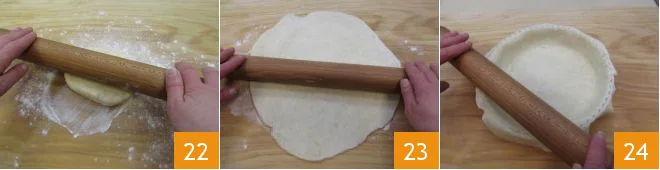 After 40 minutes, take out the shortcrust pastry, place it on a lightly floured work surface, and start rolling it out with a rolling pin 22 until you get a thickness of about 3/8 inch 23. Then transfer the pastry to a 10-inch tart pan, previously greased and floured, by rolling the dough around the rolling pin and unrolling it onto the pan. Remove the excess dough, always using the rolling pin, pressing it well on the edges of the pan 34 and set it aside.