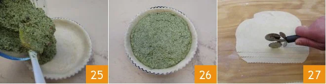 Pour the previously prepared pesto into the pan 25 and level it slightly 26. Take the excess dough, roll it out again, always obtaining a thickness of about 3/8 inch, and cut it into strips 27.