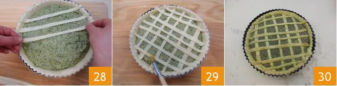 Place the strips on top of the mixture 28 and brush them with the previously beaten egg 29. Bake in a static oven at 338°F for 50 minutes (if using a fan oven, bake at 302°F for about 40 minutes). Remove from the oven 30 and let the tart with mixed pesto and bacon cool slightly before serving.