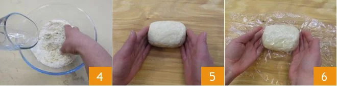 At this point, place the obtained mixture in a bowl and, adding cold water a little at a time, knead everything quickly 4, then transfer it to a work surface and continue to knead until you get a firm and fairly elastic dough 5. Once ready, wrap your shortcrust pastry in plastic wrap 6 and let it rest in the fridge for at least 40 minutes.