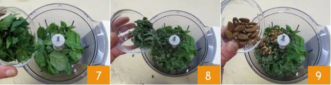 Meanwhile, start preparing the pesto for your filling. Pour the basil, parsley 7, marjoram 8, walnuts, and almonds 9 into a mixer.