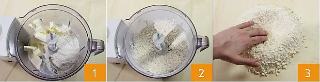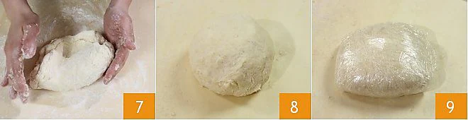 ensuring the work surface is well floured 7 until you get a smooth and fairly elastic dough 8. Once ready, wrap the shortcrust pastry in plastic wrap 9 and let it rest in the fridge for at least 40 minutes.