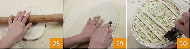 Now take the remaining shortcrust pastry, roll it out again to a thickness of 0.2 inches 28 and cut strips about 0.4 inches wide with a fluted pastry cutter 29. Now apply the strips obtained on the surface of the tart 30, spacing them a couple of inches apart and attaching them at the ends first in one direction