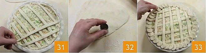 and then in the other, intersecting them diagonally to form lozenges 31. Always using the leftover pastry, cut out small circles with a round cutter about 1 inch in diameter 32 or with an apple corer and place them all around the tart as decoration 33.