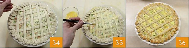 Poke the circles in the center with a wooden skewer 34. Finally, brush the tart with the beaten egg yolk 35. Bake the rustic savory tart with beer in a preheated static oven at 350°F for 1 hour (or in a fan oven at 320°F for 50 minutes). When the surface is golden, remove the rustic savory tart with beer from the oven 36 and let it cool slightly before serving.