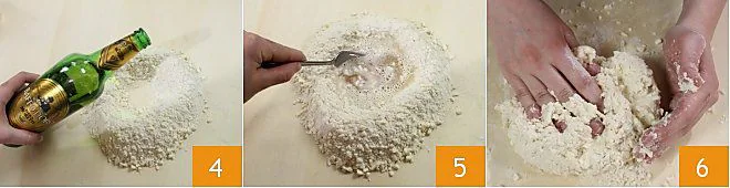 To make the rustic savory tart with beer, first prepare the shortcrust pastry: place the flour, cold diced butter, and a pinch of salt in a food processor with blades 1 and blend until you get a sandy, floury mixture 2. At this point, arrange the mixture into a fountain on a work surface 3,